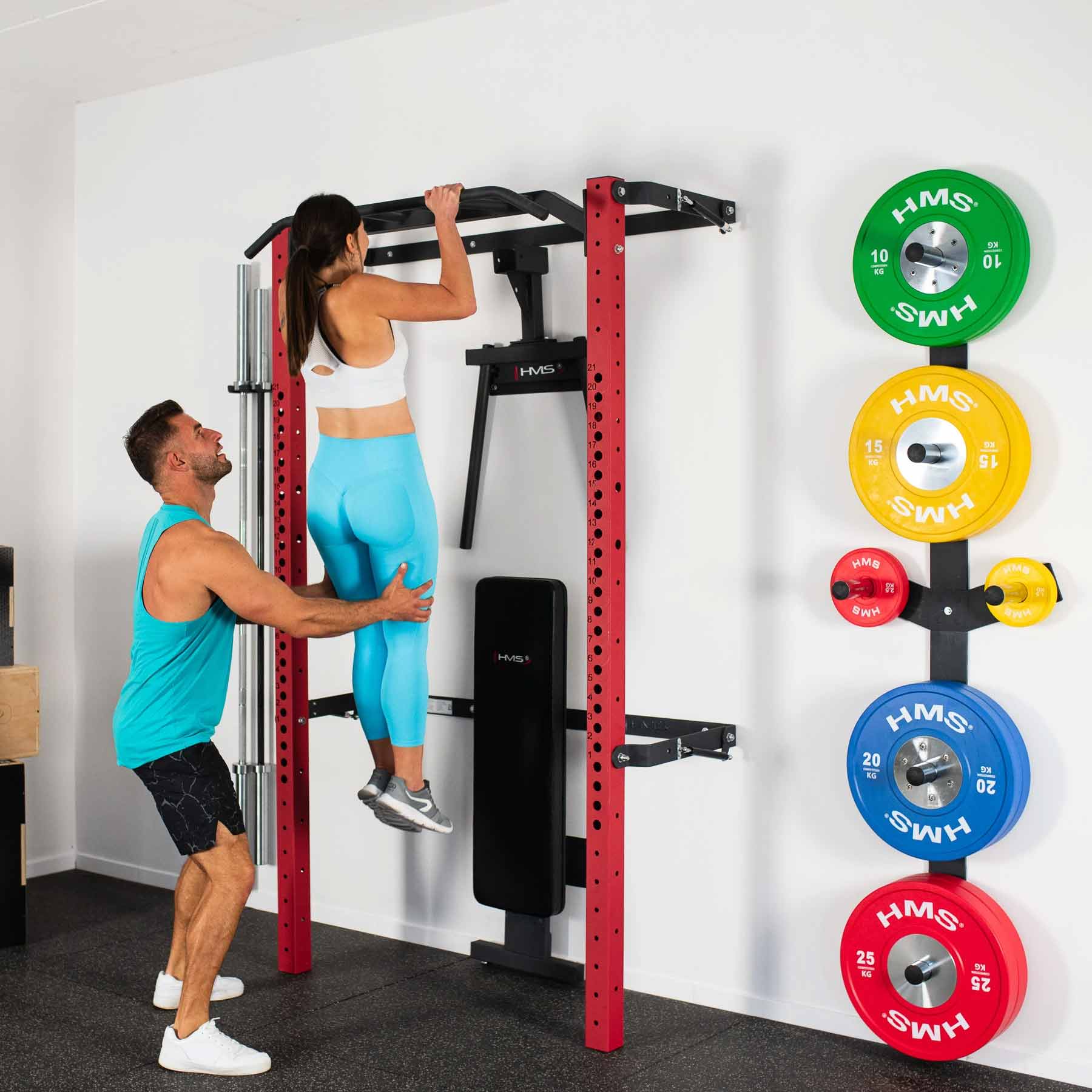 Diese Variante wird inklusive umfangreichem Zubehör geliefert. Neben der Klimmzugstange, Langhantelhaken und Sicherheitsstützen gehören eine klappbare Trainingsbank, eine Dip-Station, eine wandmontierte Gewichtsablage sowie eine Halterung für Langhantelstangen zum Lieferumfang. Das System erweitert das Trainingsspektrum deutlich und schafft gleichzeitig strukturierte Aufbewahrungsmöglichkeiten für die gesamte Ausrüstung.